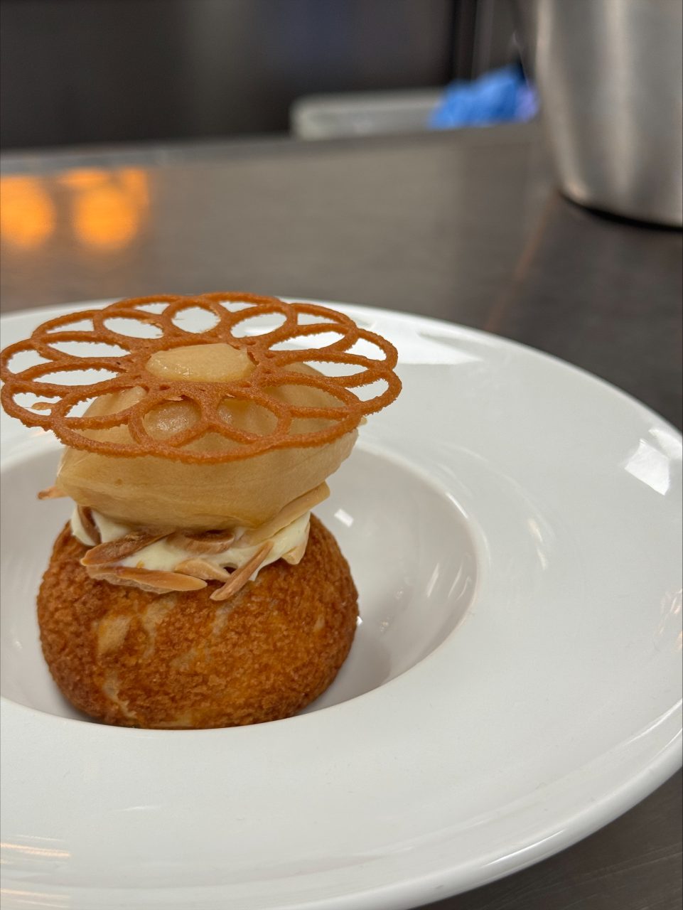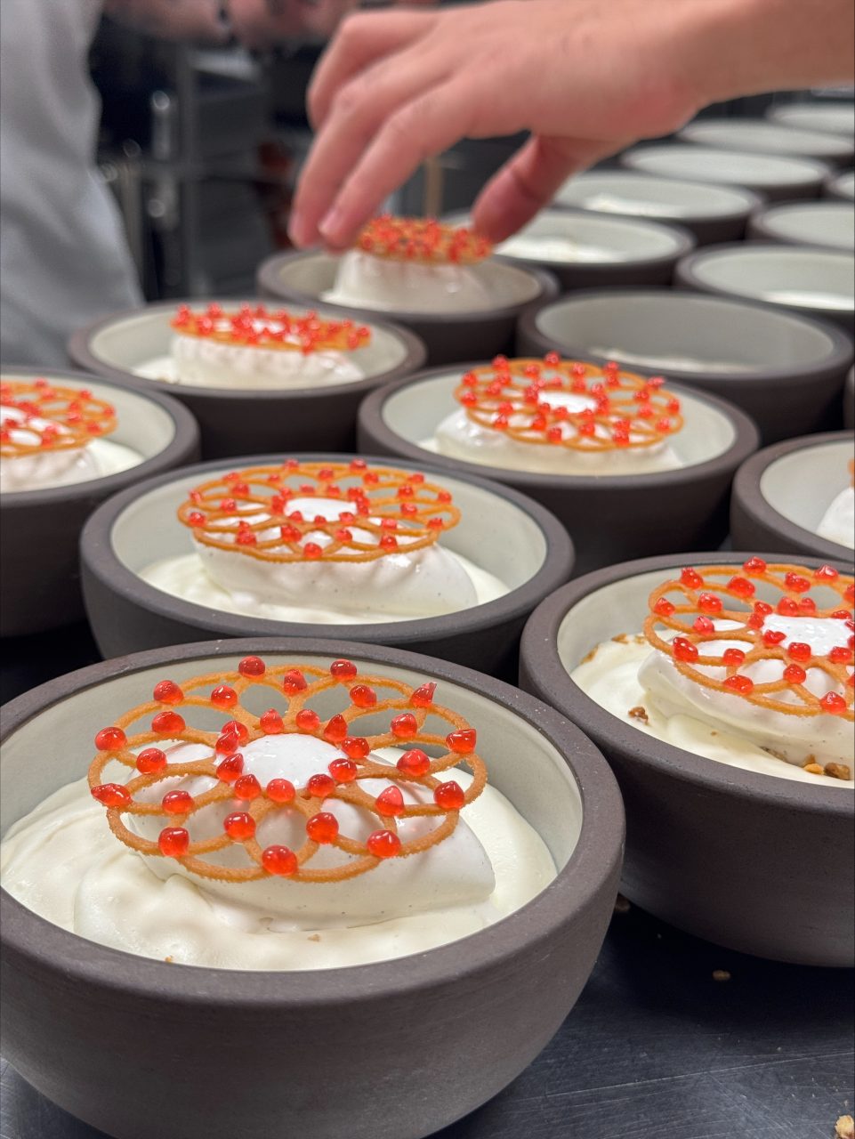 Bottoni-pasta fyldt med five spice-braiseret grisekæber, svampebouillon, urteolie og puffede ris